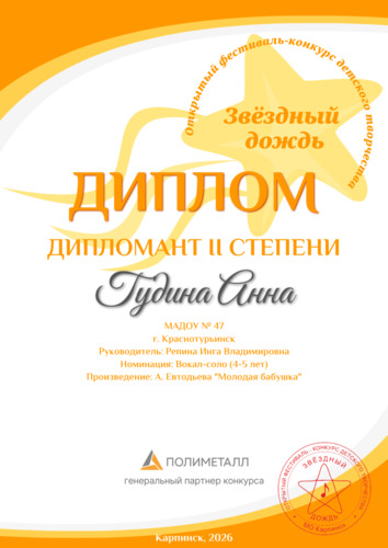 Недавно Аня Гудина, воспитанница средней группы «Вырастай-ка», приняла участие в окружном фестивале-конкурсе детского творчества «Звездный дождь», исполнив песню «Молодая бабушка», и стала дипломантом II степени. А уже на следующей неделе она будет выступать на сцене «Культурно-досугового комплекса» г. Краснотурьинска.